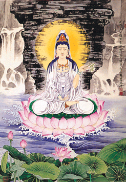 佛教的故事裡說,人人心中都有一朵蓮花。在郭恩慂的三十三觀音畫作裡,幾乎每幅都有蓮花,諸佛菩薩多以蓮花為座,無論以何種形式呈現,蓮花都是溫柔佛心的綻放。