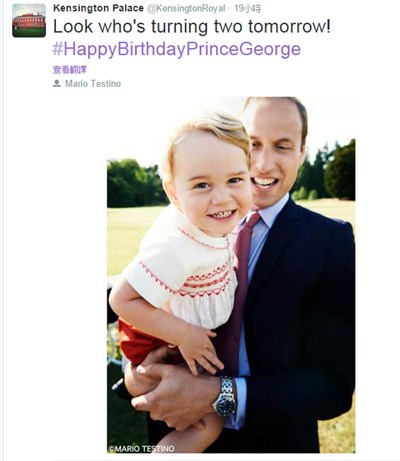 肯辛頓宮的推特和影像分享網站Instagram,已發布喬治的最新官方照片,並說明「看看明天誰要滿2歲了」,照片中可見喬治被爸爸抱在懷中,對全球知名攝影師泰斯地諾(Mario Testino)的鏡頭燦爛而笑。