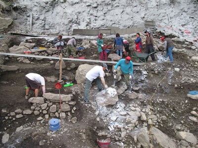中研院考古隊正在漢本遺址挖掘文物,由於範圍太大加上全部都是土石,需要以機械敲碎石頭後再清理挖掘。圖/中研院史語所研究員劉益昌提供