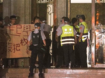 昨日晚間11時30分左右,反課綱民眾翻越教育部圍牆,部分闖入部長室,部分則被警察隔離在教育部前庭。圖/中央社
