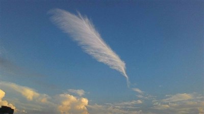 【本報台北訊】偶爾望一下天空,或許會有美麗的驚喜。氣象局預報中心主任鄭明典今天在臉書上分享照片,一朵如羽毛般的雲,點綴在湛藍天空,美麗的景象讓網友讚嘆這是天使翅膀掉落的羽毛。