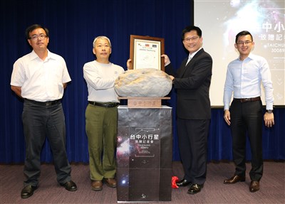 中央大學鹿林天文台觀測員林啟生(左二)將發現的一顆小行星命名為「台中」,並致贈給台中市。台中市長林佳龍(右二)今天說,台中將因此躍上宇宙,在群星之間占有一席之地。圖/中央社