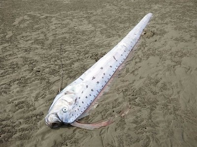 不少人一眼認出是俗稱「地震魚」的皇帶魚,直呼驚奇,恰巧今天下午2時多,宜蘭地區一連發生2起地震,認為地震剛發生就出現地震魚,實在很酷,也有人不曾看過地震魚,驚訝地說「好大隻,感覺很可怕。」