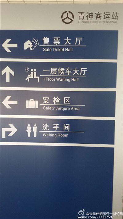 大陸四川在線報導,網友28日在青神客運站等車時,發現指示牌上的「售票大廳」被翻成「Sale ticket hall」,一樓候車大廳變成「Ⅰ Floor Waiting Hall」,安檢區變成「Salety Jerqure Area」。