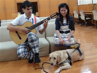 【本報高雄訊】視障夫妻辜進心、呂千毓,兩人憑著只剩下0.03的視力,帶著導盲犬瑞斯赴日進修3年,返台後推動點字樂譜,並將日本行寫成《導盲犬留日行不行?》一書。辜進心與呂千毓都是文藻專科部日文科畢業的校友。辜進心出生10個月時診斷發現左眼球細胞病變,即俗稱的「眼癌」,陸續摘除眼球。呂千毓則是從小因為先天性白內障手術失敗,右眼全盲,左眼僅剩視力0.03。雖然兩人的視力加起來只有0.03,但夫妻積極面對人生。