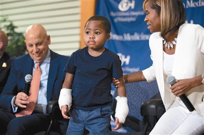 【本報綜合外電報導】美國一名因感染性壞疽失去雙手雙腳的男童,本月稍早接受手術,是全球年齡最小的雙手移植者。男童二十八日出席記者會笑咪咪地秀出新手,還透露現在最大願望,就是能快點用手丟球。