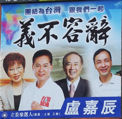 【本報台北訊】台南出現支持國民黨總統參選人洪秀柱的廣告T霸,尋求連任的國民黨立委盧嘉辰也在選區掛競選看板,看板上擠了4個人,洪秀柱與國民黨主席朱立倫站兩旁,中間是盧嘉辰和立法院長王金平。