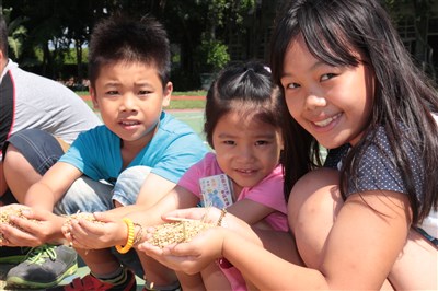 位在國小門旁的2百坪農地,現在成了孩子的最佳自然教育園地,老師找資源向農會借秧苗、肥料,請老農夫給孩子上課,並請家長會成員教導孩子如何收割,就是希望讓孩子了解農民的辛苦,知道食物得來不易,最重要的是「學會感謝」。