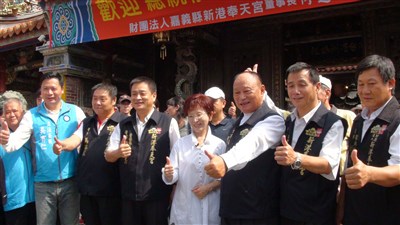 洪秀柱(中)到新港奉天參拜媽祖感恩,受到地方人士熱烈歡迎。圖/謝恩得