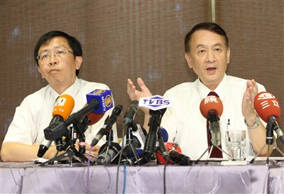 大同大學校長何明果(左)與中原大學校長張光正(右)上午聯合多位大學校長及教授發表聲明,肯定教育部提出新舊課綱並行的初步解決方案,呼籲抗議學生盡速撤離教育部,讓爭議回歸理性的討論。記者圖/余承翰
