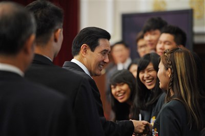 馬總統(左)3日在總統府接見「國際扶輪青少年交換計畫」交換學生,與交換學生親切談話。圖/中央社