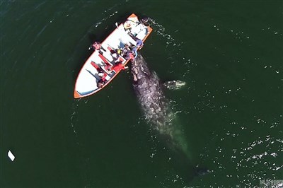 灰鯨在秋天會從加州展開為期2到3個月的遷徙旅程,現在,這些大傢伙們又因為將腦袋靠在船上休息並渴望被人撫摸,被親切地稱之為「世界上最友善的鯨魚」。這段有趣的互動被野生動物攝影家馬克卡沃汀(Mark Carwardine)用無人機拍到了,並上傳到網路上後引起熱烈回響,還有網友說:「 如此巨大的生物,明明只要抬頭就能輕鬆打翻小艇,但是卻小心翼翼靠近讓人碰觸,讓人覺得溫馨。」