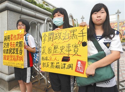 教育部長吳思華昨到台中與反課綱學生座談,座談會結束後學生仍舉牌表達反黑箱課綱訴求。圖/黃士航