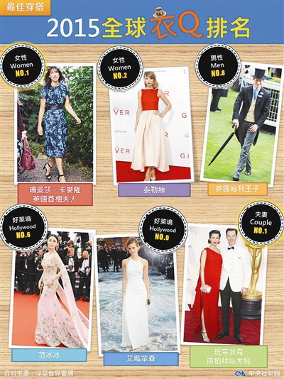 路透報導,英國首相夫人珊曼莎卡麥隆(Samantha Cameron)以倫敦設計品牌Preen藍色長洋裝拿下第一。二十五歲小天后泰勒絲在二○一五最會打扮女性前十大排名中居第二位。
