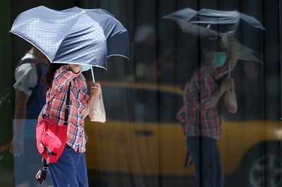 中央氣象局7日最新消息,中度颱風蘇迪勒朝台灣逼近,全台及澎湖都已進入警戒範圍。台北街頭刮起大風,行人的雨傘都快拿不穩。圖/中央社