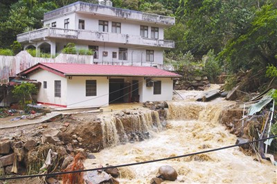 【本報新北訊】蘇迪勒颱風猛烈登陸,強風挾帶驚人豪大雨,在新北市三峽區造成多起災害。昨清晨九時三峽河暴漲至少一層樓高,位三峽竹崙山區的劉姓一家慘遭土石流衝擊,其中劉家次子為了救被土石流沖走的父親奪門而出,最後兩人雙雙被土石留帶走,至今生死未卜,一家五口三人受困兩人失蹤。