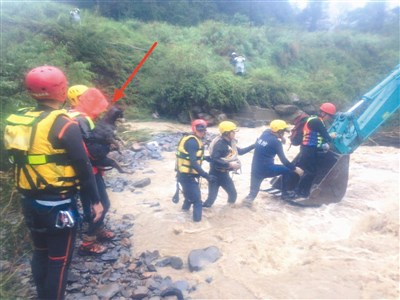 昨中午救難人員以拋繩槍、怪手交叉接駁,夏一家人輪流坐上怪手鏟子運出,黑色家犬由夏先生緊緊抱住。因台七甲線道路坍方,眾人以徒步方式走到宜蘭縣、台中市交接處的台中市警局和平分局勝光派出所休息。