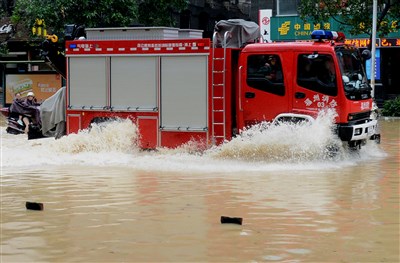 颱風蘇迪勒昨晚自中國福建省登陸,在當地帶來強降雨,造成福州市嚴重積水;圖為一輛執行任務的消防車駛過嚴重積水路段,如水上行舟。圖/中央社