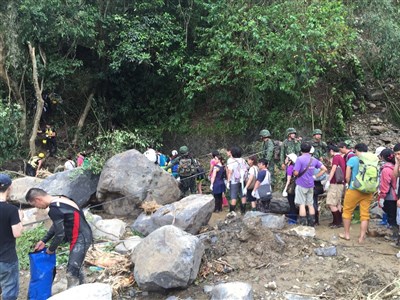 烏來聯外道路中斷,國軍、消防等救援人員挺進山區救出民眾。圖/甘育瑋