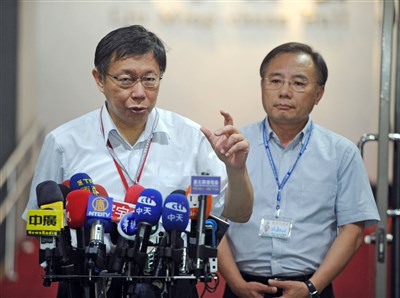 台北市長柯文哲(左)10日表示,颱風造成自來水黃濁,不是因為翡翠水庫的問題,而是從南勢溪直接進淨水廠的水太濁,他呼籲中央政府要檢查南勢溪上游的水土保持。圖/中央社