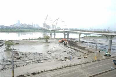 【本報新北訊】新北市長朱立倫今天上午視察新莊區重新堤外便道,堤外便道受蘇迪勒颱風影響,滿布淤泥,新北市派人清理淤泥。朱立倫表示,大部份的疏洪道昨天都已經開通,目前只剩下重新堤外道與二重疏洪道跨堤一路還在清理,今天的目標是下班時間前清理好,讓民眾上下班通行順暢。