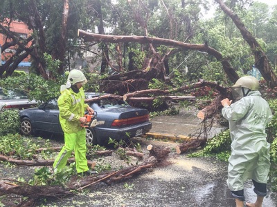 蘇迪勒強風把行道樹攔腰吹斷,殃及路旁汽車。圖/中央社