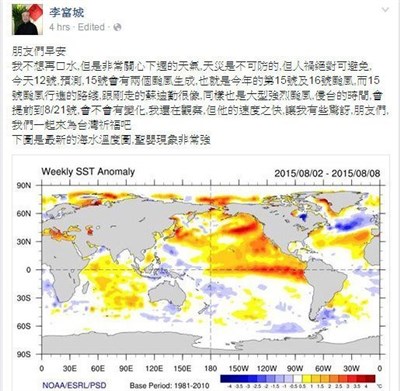 李富城昨晚PO文「高度提醒」台北市的長官,說又有新颱風在關島附近生成,行進的方向朝著西北西,可能會是「賀伯第二」,並且說這次一樣是強颱、雙颱,要「台北市的長官們,皮要繃緊一點」。