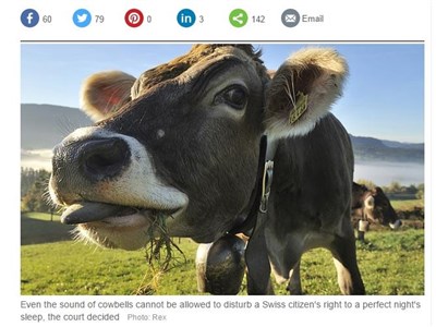 法新社與英國《每日電訊報》(Daily Telegraph)網站報導,本月稍早,蘇黎士上訴法庭勒令1名酪農夜間須把牛頸間的鈴鐺拿掉,避免擾人清夢。蘇黎士南方這座小鎮的居民4年前就開始抱怨住家附近的乳牛,埋怨頸間的牛鈴整晚響個不停。鎮公所要求這名酪農晚上把牛鈴摘下,但酪農不服,去年底告上上訴法院。