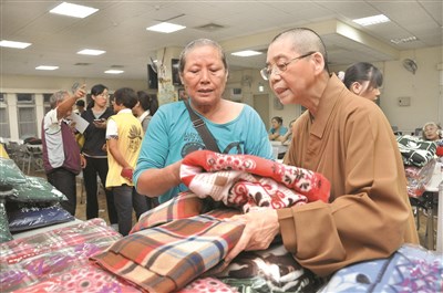 佛光山慈善院院長依來法師等人將毛毯等物資送給桃園市復興區羅浮里的災民。圖/記者邱麗玥