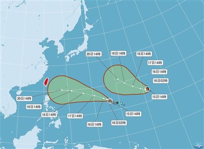 【本報台北訊】中央氣象局昨天清晨二時發展為今年第十五號颱風「天鵝」與第十六號颱風「閃電」,中央氣象局預測「天鵝」將朝著琉球海域移動,周五可能影響台灣,至於「閃電」則是會往日本東部海面而去;但「天鵝」、「閃電」距離台灣三千公里、四千三百公里,路徑預測變數仍然很大。