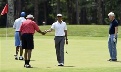 歐巴馬正在麻州的瑪莎葡萄園島和家人度假。而15日他和柯林頓、即將滿80歲的喬登、以及前美國貿易代表柯克(Ron Kirk)打了場四人二球賽。