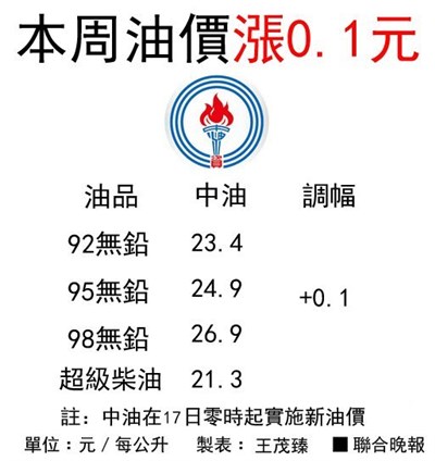 中油中午宣布從明天凌晨起調漲汽柴油牌價1角,本周中油牌價分別是92無鉛23.4元、95無鉛24.9元、98無鉛26.9元、超級柴油21.3元。