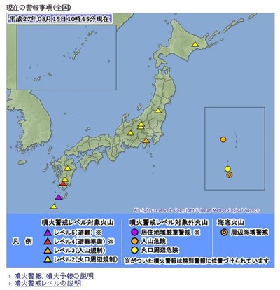 日本氣象廳研判櫻島發生大規模噴發的可能性高,宣布噴火警戒如同昨天4級。距離昭和火口、南岳山頂火口約3公尺以內的鹿兒島市有村町、古里町民眾,有必要準備疏散。昨天已有部分民眾疏散。