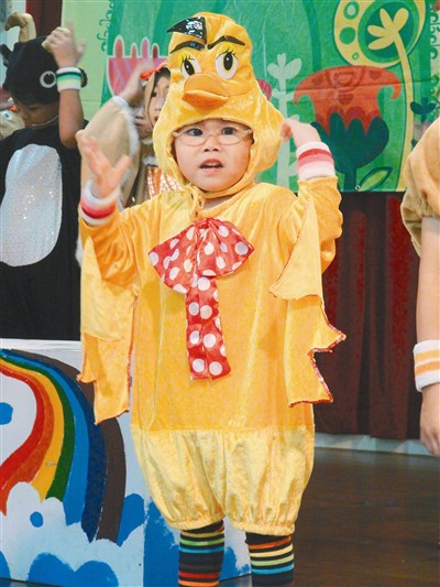 今年二月,莉雅加入弘毓基金會組成的「慢啼寶貝茄寶兒童劇團」,經過半年訓練,昨日她身穿黃色小鴨服裝,戴著厚重眼鏡,化身可愛小鴨,站在舞台上演出,讓台下觀看的父親感動不已。