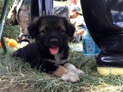 中新網報導,這隻小狗被北京軍區的防化團員在爆炸災區內救出,被取名「生化」,逃過一劫的「生化」,之後緊跟救命恩人,跟著救援人員奔忙休息。