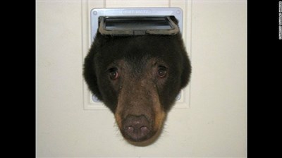 這些不請自來的熊訪客似乎食髓知味,不斷想進到他家,一次讓他覺得好氣又好笑的是,一隻小熊發現了門上方便寵物貓進出的貓門,以為自己可以像貓一樣,沒想到「頭過身不過」硬生生地卡在小門。
