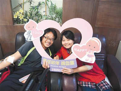 蘇迪勒颱風與周末雨勢攪局,捐血量低,急需民眾挽袖捐血。圖為情侶攜手捐血留影。圖/資料照片