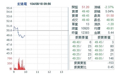 宏達電日前宣布新的營運計畫,目標減少總體營運費用35%,並於年底前縮減全球員工人數15%,估計裁員人數將達2250人。宏達電近2個交易日股價仍守住50元大關,外資更延續2日買超2500張,但早盤股價翻黑,再度摜破50元大關,最低至48.95元,創新低。