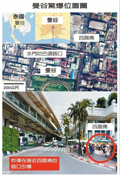 【速讀】曼谷四面佛爆炸事件 |2015.08.18 語音朗讀 883觀看次 字級 大 中 小 曼谷驚爆位置圖。圖/聯合報系提供 ● 時間:8月17日晚間9時左右 ● 地點:曼谷鬧區四面佛景點 ● 傷亡:至少22死超過120人傷 ● 原因:現場發現3顆炸彈,第1顆引爆後,警方找到第2、3顆,順利拆除。 ● 有6名台灣人受傷,其中徐姓男子傷勢最重,正在朱拉隆功醫院加護病房救治。 ● 曼谷10處危險區域:四面佛附近、席隆路、考山路、Narattiwat Road、勝利紀念碑、Rama 6、Emporium百貨附近Benjasiri、通羅及蘇坤逸路,請民眾暫時不要前往。 前一篇文章 傳四面佛爆炸炸彈客落網 泰官方否認 下一篇文章 中颱「天鵝」慢飛 最快明晚發海警 熱門新聞 01【遨遊藝事】 威尼斯沉船書店2025.12.2902看人間 厭童、厭老,然後呢?2025.12.3003【閃文集】泰勒絲與狄金遜2025.12.3004宜蘭7.0地震 921後第3強震2025.12.2905【收穫滿滿】 快樂練氣功2025.12.3006走每一步 計步器 都知道2025.12.2907【動物奧斯卡獎】猜猜誰最會演(中)2025.12.2808元旦寶寶 桃園、新竹市逆勢成長2026.01.0209【修行在人間】佛心的慈視82025.12.2810致護法朋友們的一封信2026.01.01 訂閱電子報 台北市 天氣預報 台灣一週天氣預報 相關報導 【星雲大師如是說】處事禪心【星雲大師如是說】人間佛教【星雲大師如是說】正信之美【星雲大師如是說】輪轉相繼【星雲大師如是說】有情的層次【星雲大師如是說】六忍歌