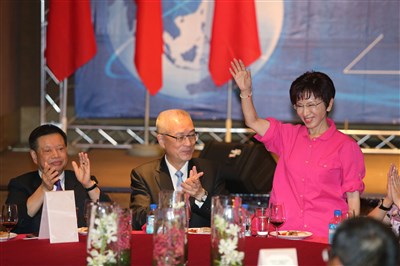 洪秀柱說,從政後要嫁掉真的不容易。圖為副總統吳敦義(中)與洪秀柱(右)受邀出席工商建研會台北舉行第32期聯誼會。圖/中央社