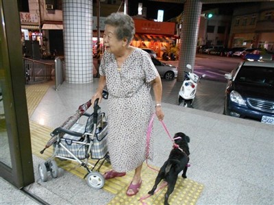 【本報高雄訊】高雄市旗山區88歲林阿嬤飼養一隻鬥牛犬作伴多年,昨日下午鬥牛犬走失,老阿嬤著急四處找尋,同時間警方也正沿著中山路,挨家挨戶幫小狗找主人;直到晚間8點,老阿嬤到警局報警,在警局門口看見走失的愛犬,人犬相逢場面溫馨。