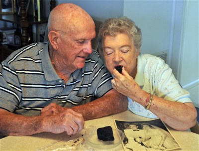 19日是佛羅里達州夫妻肯恩和安妮結婚60周年,兩老共享他們1955年8月19日的結婚蛋糕。這三層傳統深色水果蛋糕是安妮的奶奶當年做給小倆口的,用塑膠膜包著,放在咖啡罐裡,以室溫保存,每逢結婚周年,就從頂層取一小塊共享,加些白蘭地以利濕潤入口,60年如一日。圖/美聯社