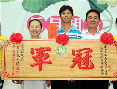 嘉義縣政府今天舉辦第5屆甜姐兒高品質甜瓜評鑑,經過激烈競爭,來自水上鄉的果農曾啟榮(中)過關斬將,勇奪甜瓜王頭銜,由縣長張花冠(左)頒獎。圖/中央社