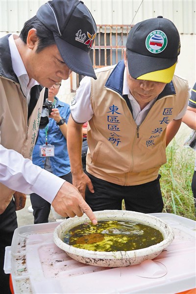 台南市長賴清德(左)在東區視察時,發現飲料店後方空地的積水容器內有孑孓。圖/鄭維真