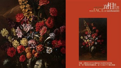 這次的達文西畫展一共展出55幅私藏於義大利各地,受達文西畫風影響的經典畫作,皆為真跡。被破壞的油彩畫作品《花》是超過200公分高的巨幅畫作,年代追朔於17世紀,作者受達文西靜物畫的影響,在平面上用手繪製出有立體效果的植物與花朵。