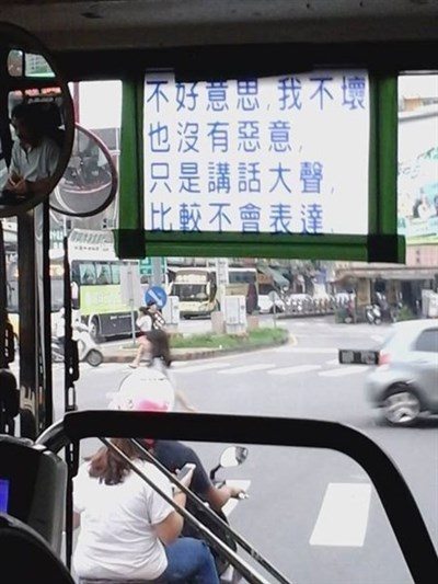網友在臉書社團《爆料公社》貼出了一張圖,說自己在搭台中總達客運時,看到公車擋風玻璃上,貼著大大的公示,上面寫著「不好意思,我不壞,也沒有惡意,只是講話大聲,比較不會表達。」,網友看了覺得「司機難為」、「很多司機人很好,只是講話大聲沒笑就會以為被凶」、「有心酸的感覺」。