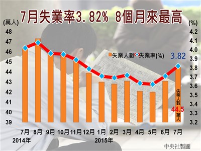 行政院主計總處今天公布,7月失業率為3.82%,為過去8個月來最高,較上月上升0.11個百分點,較去年同月則降0.20個百分點。圖/中央社