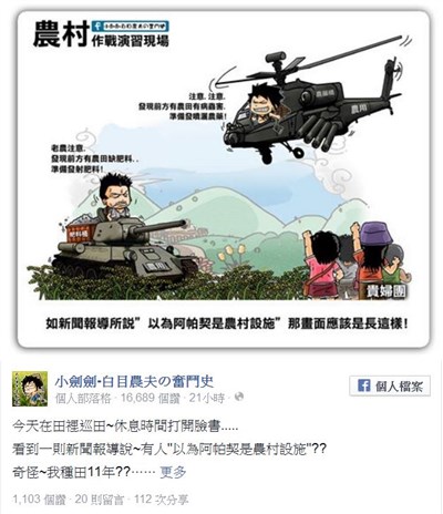 【本報台北訊】阿帕契事件,傳出貴婦團中有人「以為阿帕契是農村設施」,引起青年農民議論,青農謝銘鍵在臉書上說,「務農11年,怎不知有這麼昂貴的農機具?」並畫了插畫,「幽默」一下貴婦的無厘頭。