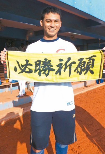 中華隊左投葉文淇亮出日本移訓時購買的「 必勝祈願」毛巾,希望在U18世界杯拚出佳績。圖/藍宗標