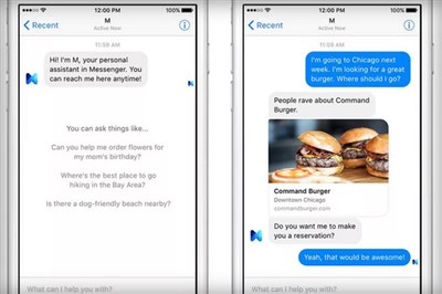 M基於人工智慧技術,但仍由真人來訓練和監控。使用者以文字的方式詢問M,它就會給你解答,像是餐廳訂位、為家人選生日禮物等,都可以找M幫你解決,只是這些解答除了由人工智慧技術所提供,還加入了真人的意見。